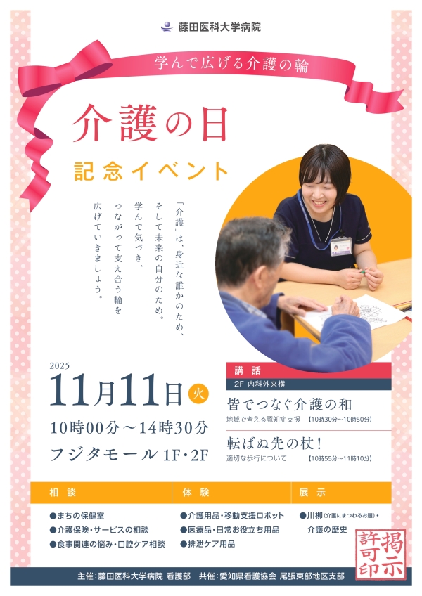 「介護の⽇」は⾼齢化により介護を要する⼈⼝の増加や、介護に関する課題の多様化に向けて、介護に関する理解と認識を深めることを⽬的に設定されました。介護にまつわる悩みや弊害を減らし、在宅⽣活の促進に貢献するため「介護の⽇のイベント」を開催します。ぜひご参加ください。